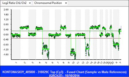 • Στη μήτρα μεταφέρονται μόνο τα έμβρυα εκείνα που κρίνονται φυσιολογικά (εικόνα 2) βάσει των αποτελεσμάτων αφού προηγηθεί συζήτηση των αποτελεσμάτων με το ζευγάρι. Παράδειγμα ανευπλοειδικών αποτελεσμάτων με απλή-μονοσωμία του χρωμοσώματος 14- (εικόνα 3) και σύνθετες χρωμοσωμικές ανωμαλίες (εικόνα 4). Η αξιοπιστία της μεθόδου είναι αρκετά υψηλή και ανιχνεύει γενετικές ανωμαλίες με συχνότητα 20% ανώτερη σε σχέση με τις παλαιότερες τεχνικές (FISH-για ανάλυση εώς και 12 ζευγών χρωμοσωμάτων) που χρησιμοποιούνται έως σήμερα. Αξίζει να σημειωθεί ότι υπάρχει περίπτωση μη εμβρυομεταφοράς όταν η γενετική ανάλυση δείξει ότι όλα τα αναλυθέντα έμβρυα έχουν ανευπλοειδίες.