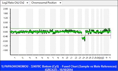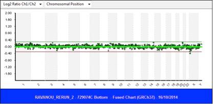 • В матку вводятся только те эмбрионы, которые считаются нормальными (картинка 2) на основании результатов и после их обсуждения с парой. Пример анеуплоидных результатов с простой моносомией хромосомы 14 (картинка 3) и сложных хромосомных нарушений (картинка 4). Надежность метода достаточно высока, он выявляет генетические нарушения с частотой 20%, что выше по сравнению с предыдущими методами (FISH – для анализа до 12 пар хромосом), которые использовались до настоящего времени. Стоит отметить, что имеется вероятность отмены введения эмбриона, если генетический анализ показывает, что все проанализированные эмбрионы имеют анеуплоидии.